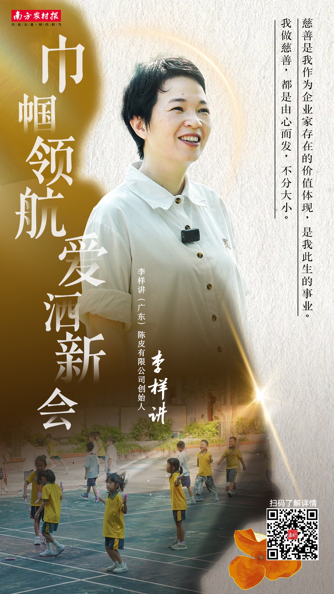 从企业家到公益践行者,行动李样讲(广东)陈皮有限公司的掌舵东说念主,李样讲以一派陈皮为支点,撬动产业链条,激活乡村经济,成为新时期梓里回馈者的生动缩影,展现出苍劲的职守担当。